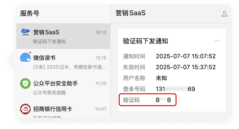 驗證碼將通過“營銷SaaS”公眾號下發