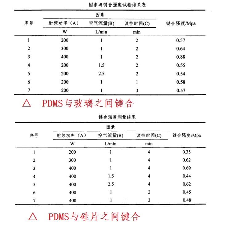 關于PDMS鍵合的效果,不僅和表面改性方法,也和表面改性后多久進行鍵合、鍵合時間長短和鍵合時的壓力都有一定的關系。